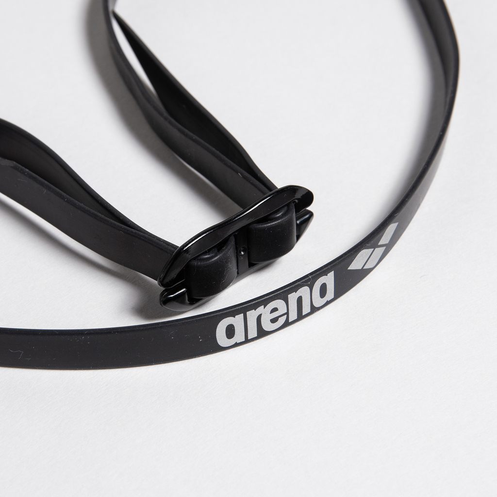 Hydrodynamisches Design für verringerten Wasserwiderstand. Innovativer verlängerter Rahmen für zusätzliche Stabilität. Austauschbarer Nasensteg, doppeltes Kopfband und UV-Schutz.