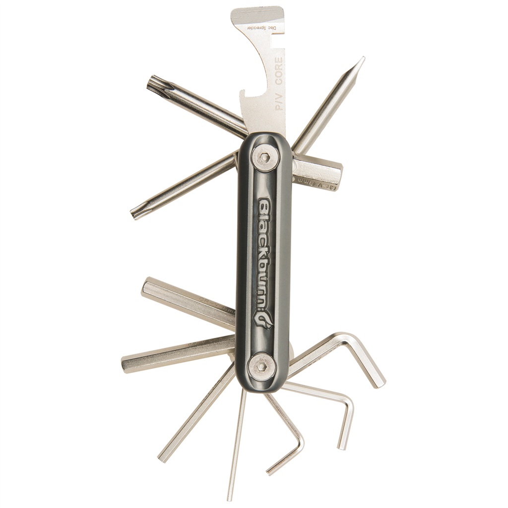 Kompaktes Multi-Tool mit 13 Funktionen: Innensechskant (1.5/2/2.5/3/4/5/6/8), Torx (T25/T30), Ventilschlüssel, Flachschraubenzieher, Bremsbelagspreizer, Flaschenöffner.