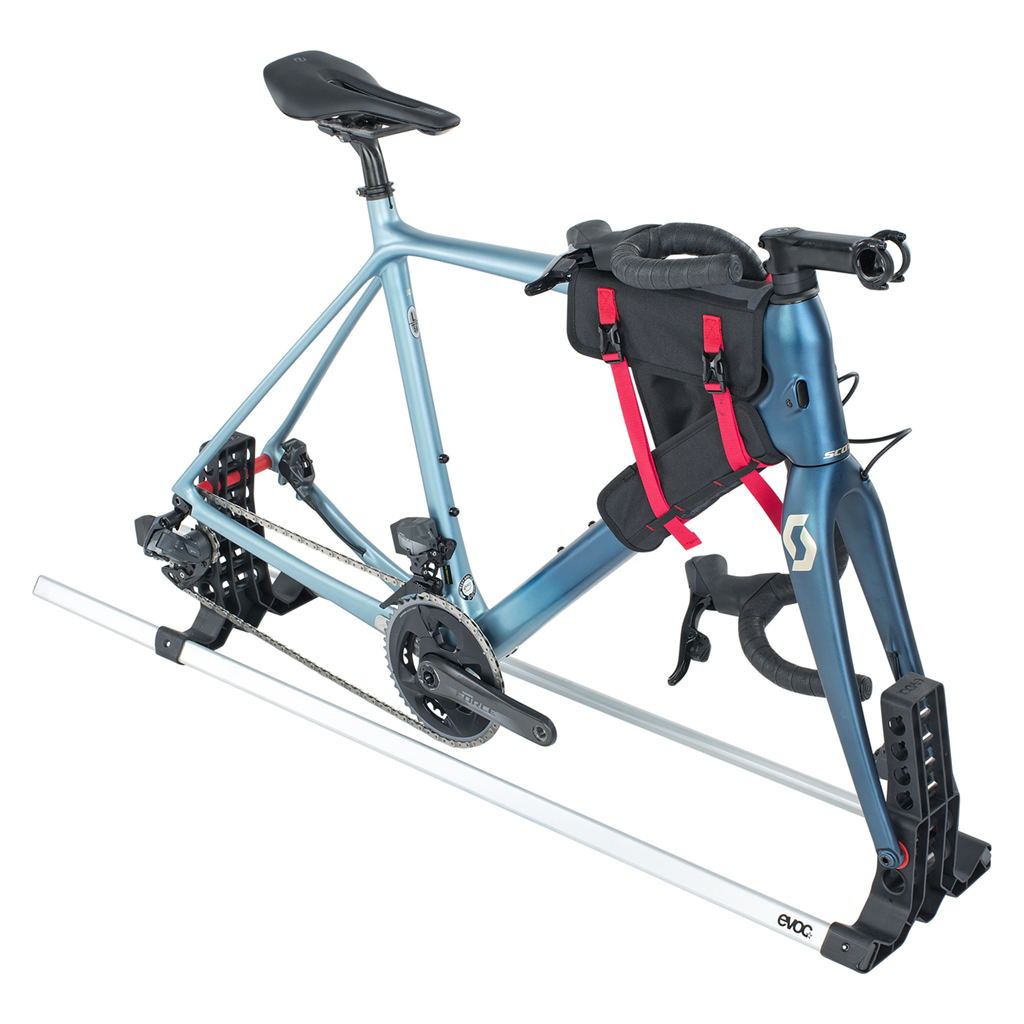 Längenverstellbarer BIKE STAND mit variablen Achsen-Fixierungen, kompatibel mit den EVOC BIKE BAGs für einen sicheren Stand aller Fahrradtypen.