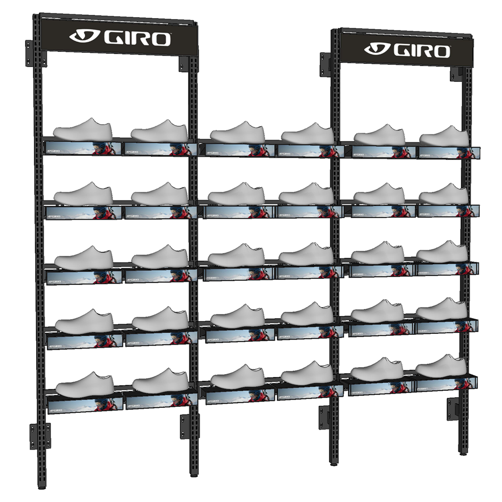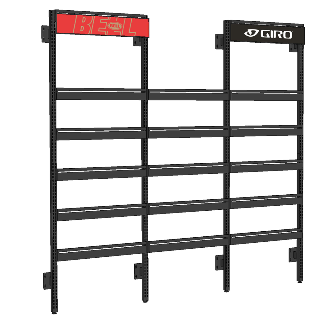 Inklusive: 4x Modular Wall Mounted Upright; 18x Slat Crossbar 30"/74cm; 2x Header Sign - 30"/6" 76cm/15cm (je 1 Giro/Bell/Blackburn)