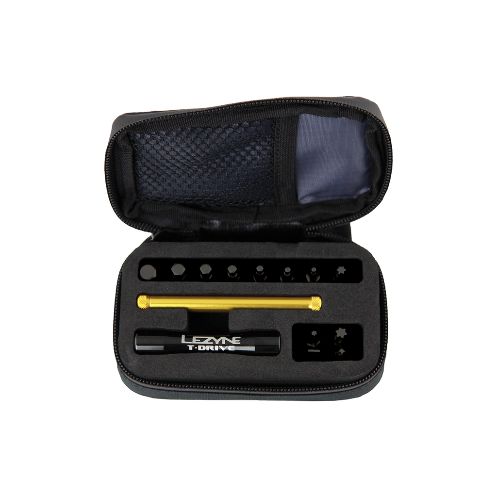 Der robuste T-Griff-Bithalter T-Drive ist ein platzsparendes Werkzeug für die Wartung und Einstellung von Fahrrädern für unterwegs. Seine Konstruktion aus gefrästem Aluminium verfügt über einen abnehmbaren Griff, so dass er platzsparend in einer Soft Shell Box transportier werden kann, und ein integrierter Magnet hält die Werkzeugbits sicher an ihrem Platz. Die Box ist bestückt mit: Innensechskannt: 2, 2.5, 3, 4, 5, 6, 8mm; Torx: T10, T25, T30; Schlitz und Kreuzschlitz Schraubendreher-Bits.