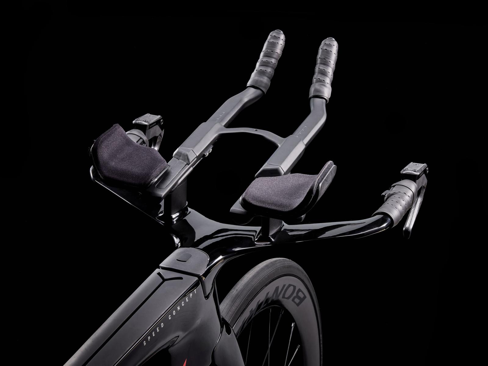 Einen ultraleichten Rahmen aus 800 Series OCLV Carbon, windschnittige Rohre mit Kammtail Virtual Foil-Profil (KVF), eine Speed Concept-Carbongabel mit aerodynamischem Profil, straßenglättendes IsoSpeed, integrierte Aufbewahrungslösungen für Verpflegung, Flüssigkeit und ein Pannenkit, einen drahtlosen elektronischen SRAM RED AXS 12fach-Antrieb mit SRAM AXS Blips-Schalthebeln, einen SRAM RED AXS-Powermeter, einen vollständig integrierten Lenker samt Vorbau, einen triathlonspezifischen Bontrager Hilo Pro-Carbonsattel für eine aggressive Aero-Sitzposition, zuverlässig zupackende Scheibenbremsen und aerodynamische Bontrager Aeolus RS