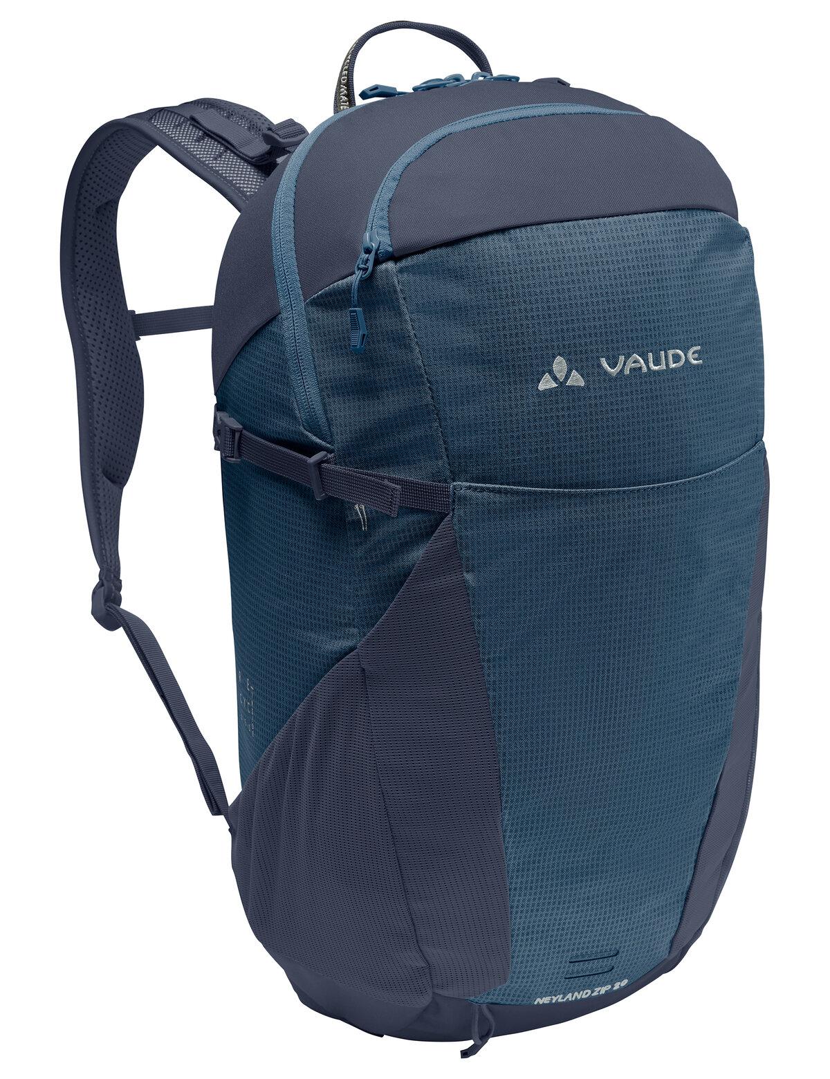 Modern und alltagstauglich - der Toploader Rucksack Neyland Zip 20 mit abnehmbarem Hüftriemen. Dieser multifunktionelle Rucksack eignet sich fürs Wandern und Klettersteige genauso wie für Uni und Stadtalltag. Das innovative Rückensystem mit den strukturierten Schaumstoffmodulen sorgt für eine gute Belüftung und gleichzeitig für einen stabilen Rückenkontakt. Die Schulterträger sind weich gepolstert und sorgen für einen guten Tragekomfort. Die integrierte EMP Platte (ergonomic movement panel) unterstützt die natürliche Rückenbeugung beim Aufstieg oder auf dem Fahrrad und verhindert, dass das Gepäck auf den Rücken durchdrückt. Ausgestattet ist der vielseitige Wanderrucksack mit einem großen Hauptfach und einem separaten Trinksystemfach, das alternativ auch als Laptopfach (bis 15" Zoll) verwendet werden kann. Die großzügige Reißverschluss-Fronttasche hat zusätzlich ein gepolstertes Handyfach. In die seitlichen Stretch-Taschen passen Getränk oder Mütze. Wanderstöcke können an der Stockbefestigung befestigt werden und die seitlichen Kompressionsriemen dienen als weitere Gepäckfixierung. Weiteres Gepäck kann in die offene Stretchtasche auf der Front verstaut werden. Eine Regenhülle ist inklusive. Der Neyland Zip 20 wurde aus überwiegend recyceltem Material hergestellt. Das VAUDE Green Shape-Label steht für ein umweltfreundliches, funktionelles Produkt aus nachhaltigen und bluesign® zertifizierten Materialien.